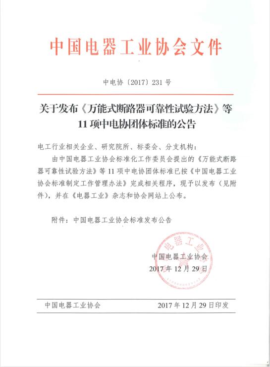 關(guān)于T/CEEIA 286-2017《發(fā)布萬能式斷路器可靠性試驗(yàn)方法》等11項(xiàng)中電協(xié)團(tuán)體標(biāo)準(zhǔn)的公告