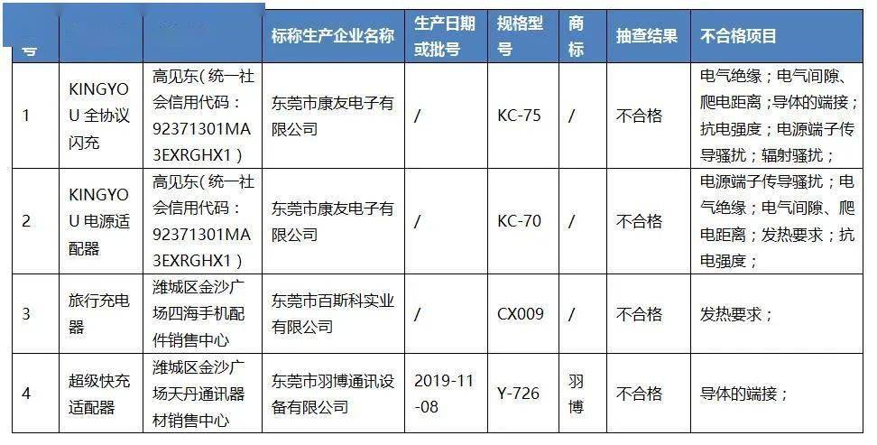 近日,山東省市場(chǎng)監(jiān)督管理局網(wǎng)站公布2020年充電器產(chǎn)品質(zhì)量省級(jí)監(jiān)督抽查結(jié)果。本次共抽查了全省6家企業(yè)10批次充電器產(chǎn)品,其中,流通領(lǐng)域6家企業(yè)10批次。抽查發(fā)現(xiàn)3家企業(yè)的4批次產(chǎn)品不符合相關(guān)標(biāo)準(zhǔn)的要求,不合格項(xiàng)目為電氣絕緣、電氣間隙、爬電距離、導(dǎo)體的端接、發(fā)熱要求、抗電強(qiáng)度、電源端子傳導(dǎo)騷擾、輻射騷擾項(xiàng)目。