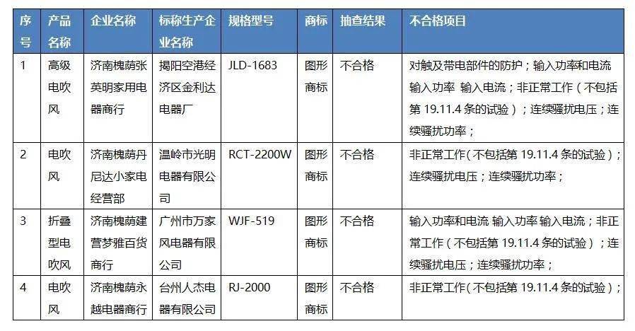 山東省市場(chǎng)監(jiān)督管理局網(wǎng)站公布本次共抽查了全省9家企業(yè)10批次電吹風(fēng)產(chǎn)品,其中,流通領(lǐng)域9家企業(yè)10批次。抽查發(fā)現(xiàn)4家企業(yè)的4批次產(chǎn)品不符合相關(guān)標(biāo)準(zhǔn)的要求,不合格項(xiàng)目為對(duì)觸及帶電部件的防護(hù)、輸入功率和電流、非正常工作、連續(xù)騷擾電壓、連續(xù)騷擾功率項(xiàng)目。