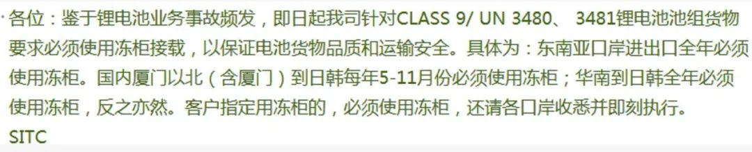 近期由于鋰電池運輸過程中屢次出現各類危險性事故, 山東海豐國際船務公司SITC通知, 即日起對Class 9/UN 3480, UN3481鋰電池組以及裝有鋰電池的設備等貨物必須使用冷藏貨柜運輸。