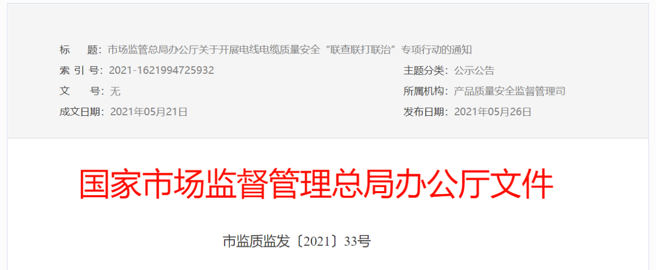 電線電纜是涉及國計民生的重要工業產品。近年來,全國市場監管系統持續開展電線電纜生產企業專項整治,行業秩序日趨規范,質量水平穩步提升,但還存在流通領域不合格問題突出、導體電阻等重要指標不符合標準要求、偷工減料生產“打折”電纜時有發生等問題。為進一步促進電線電纜行業持續健康發展,保障人民群眾生產生活放心安穩,市場監管總局決定聚焦電線電纜產品質量問題突出的重點區域、重點品種、重點問題,開展電線電纜質量安全“聯查聯打聯治”專項行動。