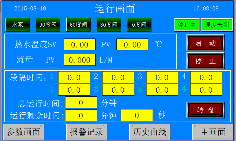 本設備所有的控制設置,水溫、噴頭控制、壓力、時間,流量要求用一個7英寸松下觸摸屏及Delta德爾塔儀器智能PLC控制程序來完成;