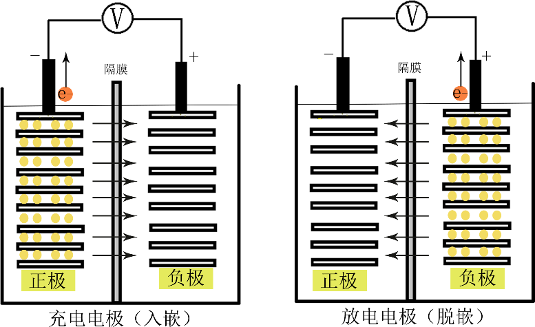 具體的電池充電過程中,外電壓加載在電池的兩極,鋰離子從正極材料中脫嵌,進入電解液中,同時產生多余電子通過正極集流體,經外部電路向負極運動;鋰離子在電解液中從正極向負極運動,穿過隔膜到達負極石墨層狀結構中,并與電子結合。放電過程與之相反,鋰離子從負極表面脫嵌經過電解液,同時產生多余電子通過負極集流體,經外部電路向正極運動;再穿過隔膜在電解液的作用下嵌入到正極材料中,與正極集流體上的電子結合。