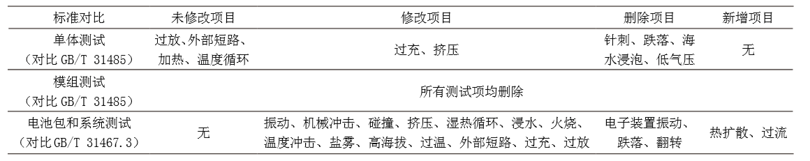 由以上檢測標準可知,國內外動力電池的安全性測試分為3大類:機械安全測試類(振動、沖擊、擠壓等)、環境安全測試類(熱沖擊、溫濕循環、高溫等)、電氣安全測試類(短路、過充、過放等),各個檢測項目的檢測條件上國內外標準有些差異,但整體區別不大。對比GB/T 31485-2015、GB/T 31467.3-2015,我國新國標GB 38031-2020中刪除了跌落、翻轉、針刺等機械安全類測試項,新增了熱擴散和過流檢測,將電池包和系統作為安全重點要求對象,為我國首次將動力電池安全性檢測作為強制性標準。