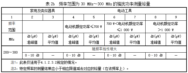 表2a 頻率范圍為30 MHz~300 MHz的騷擾功率限值