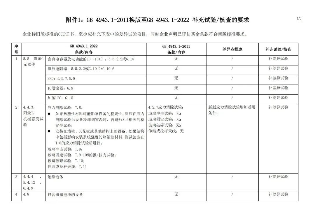 1.GB 4943.1-2011 換版至 GB 4943.1-2022 補(bǔ)充試驗(yàn)/核查的要求(見附件1)。