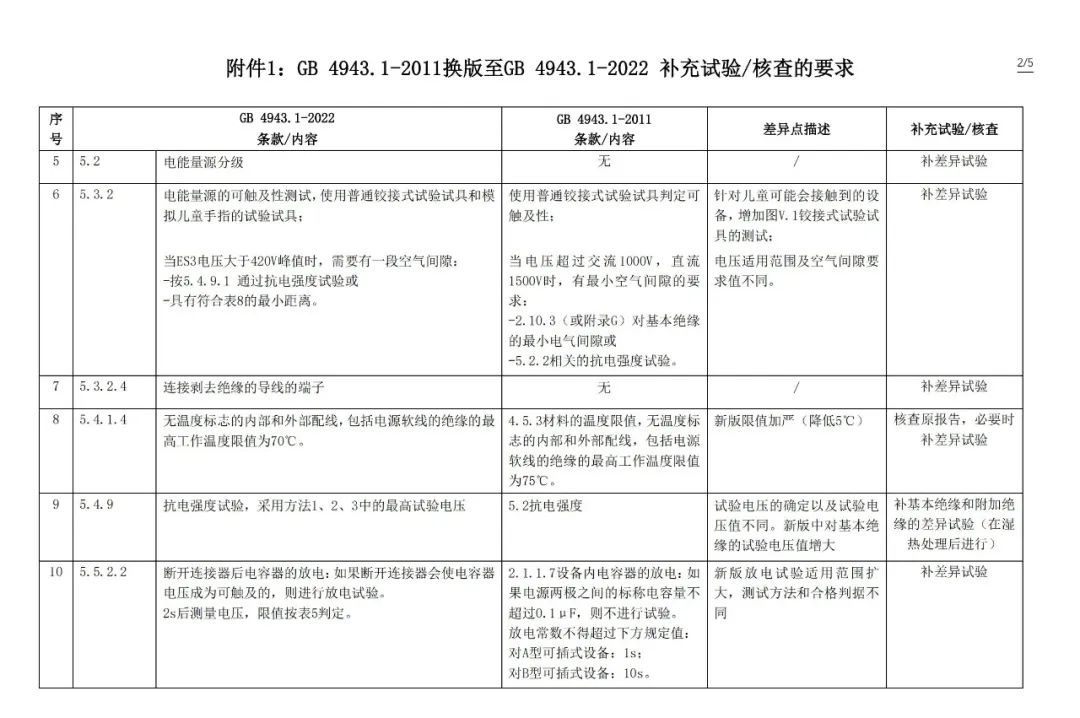 2.GB 8898-2011 換版至 GB 4943.1-2022 補(bǔ)充試驗(yàn)/核查的要求(見附件2)。