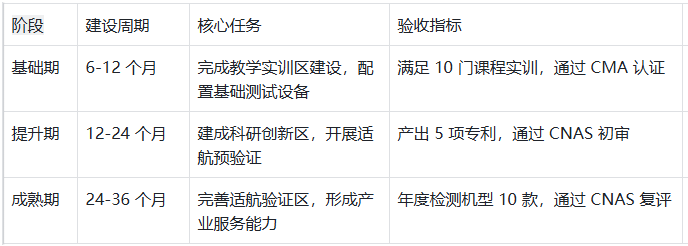 在基礎(chǔ)期,建設(shè)的重點是搭建教學(xué)實訓(xùn)區(qū),為學(xué)生提供一個良好的實踐學(xué)習(xí)環(huán)境。配置基礎(chǔ)測試設(shè)備,如無人機飛行模擬器、基礎(chǔ)測試儀器等,滿足《無人機飛行原理與實踐》《無人機組裝與調(diào)試》等 10 門課程的實訓(xùn)需求。同時,積極申請 CMA 認(rèn)證,建立完善的質(zhì)量管理體系,確保實驗室的測試數(shù)據(jù)準(zhǔn)確可靠,為后續(xù)的發(fā)展奠定堅實的基礎(chǔ)。